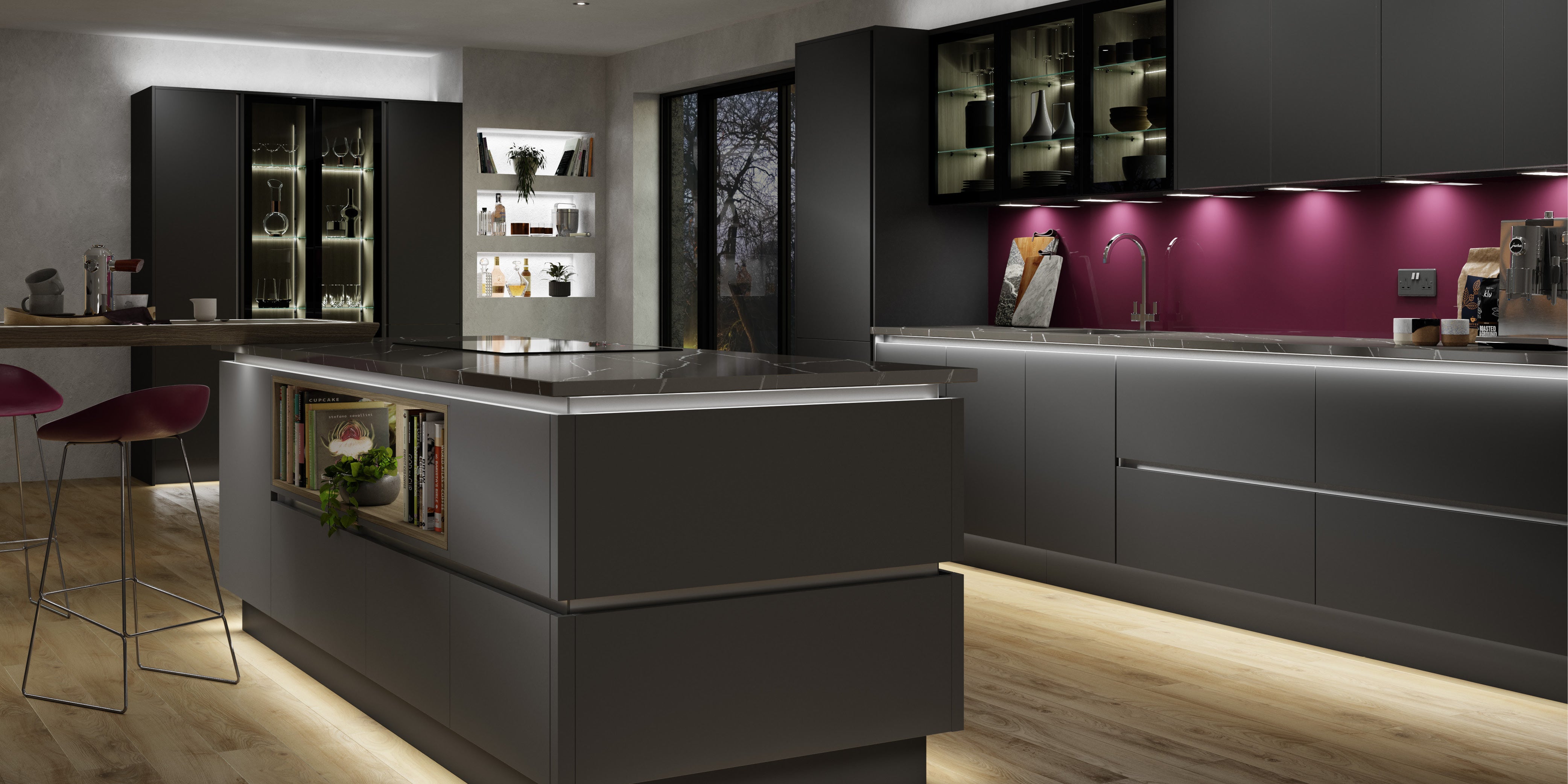 Mood lighting creates depth and dimension, which is essential for creating atmosphere within a room. Consider lighting along the plinth, up-lighting above wall units, lighting beneath breakfast bars or the underside of a worktop and lighting the inside of glass fronted cabinets.