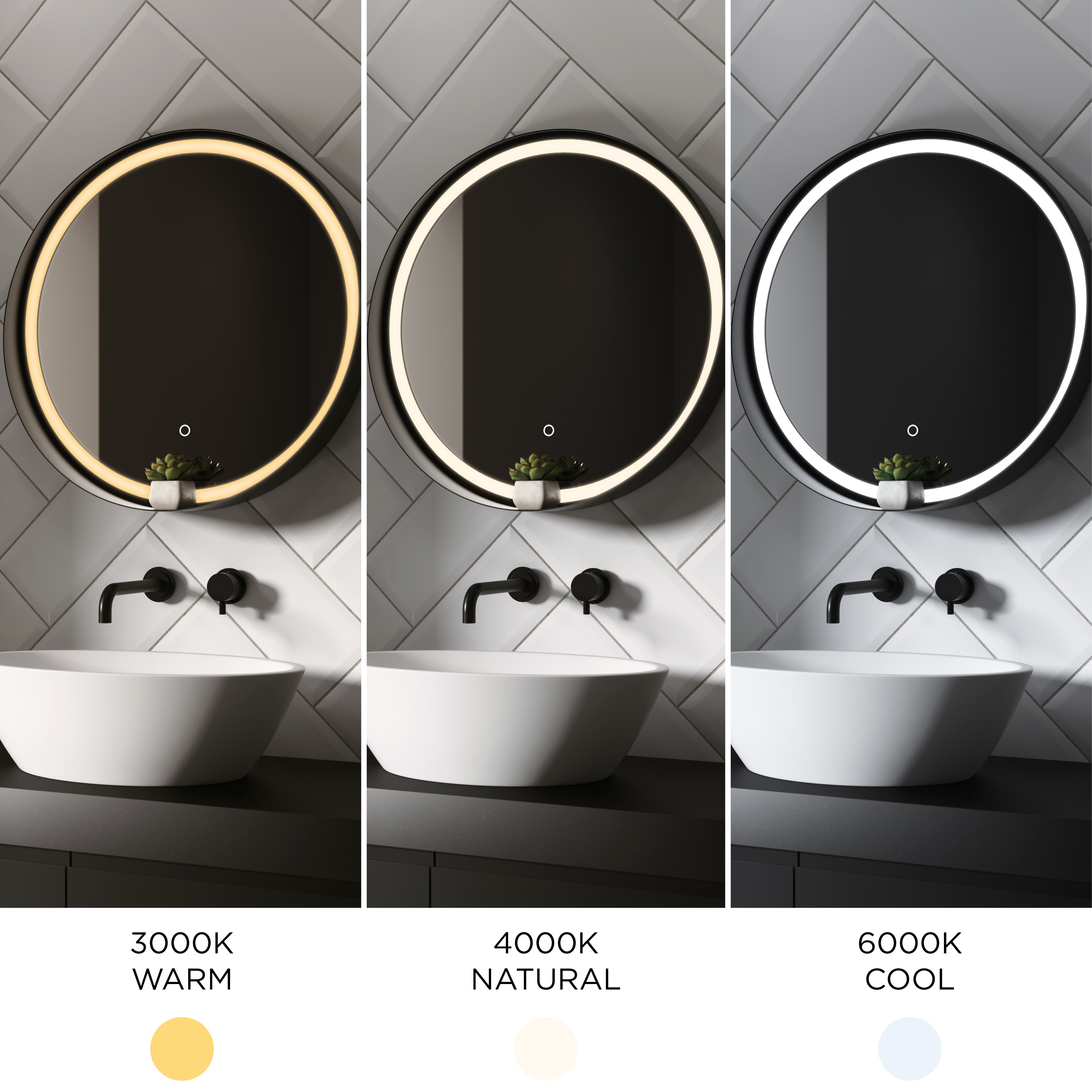 TrioTone® offre un choix d'éclairage 3-en-1 dans un luminaire ou un miroir lumineux. Ces produits permettent non seulement de sélectionner ou de modifier la température de couleur sans avoir à remplacer l'ensemble du luminaire, mais également, dans les miroirs dotés de cette technologie, de permettre au propriétaire d'ajuster la température de la lumière en fonction de l'heure de la journée, de l'ambiance et de ses préférences personnelles. .