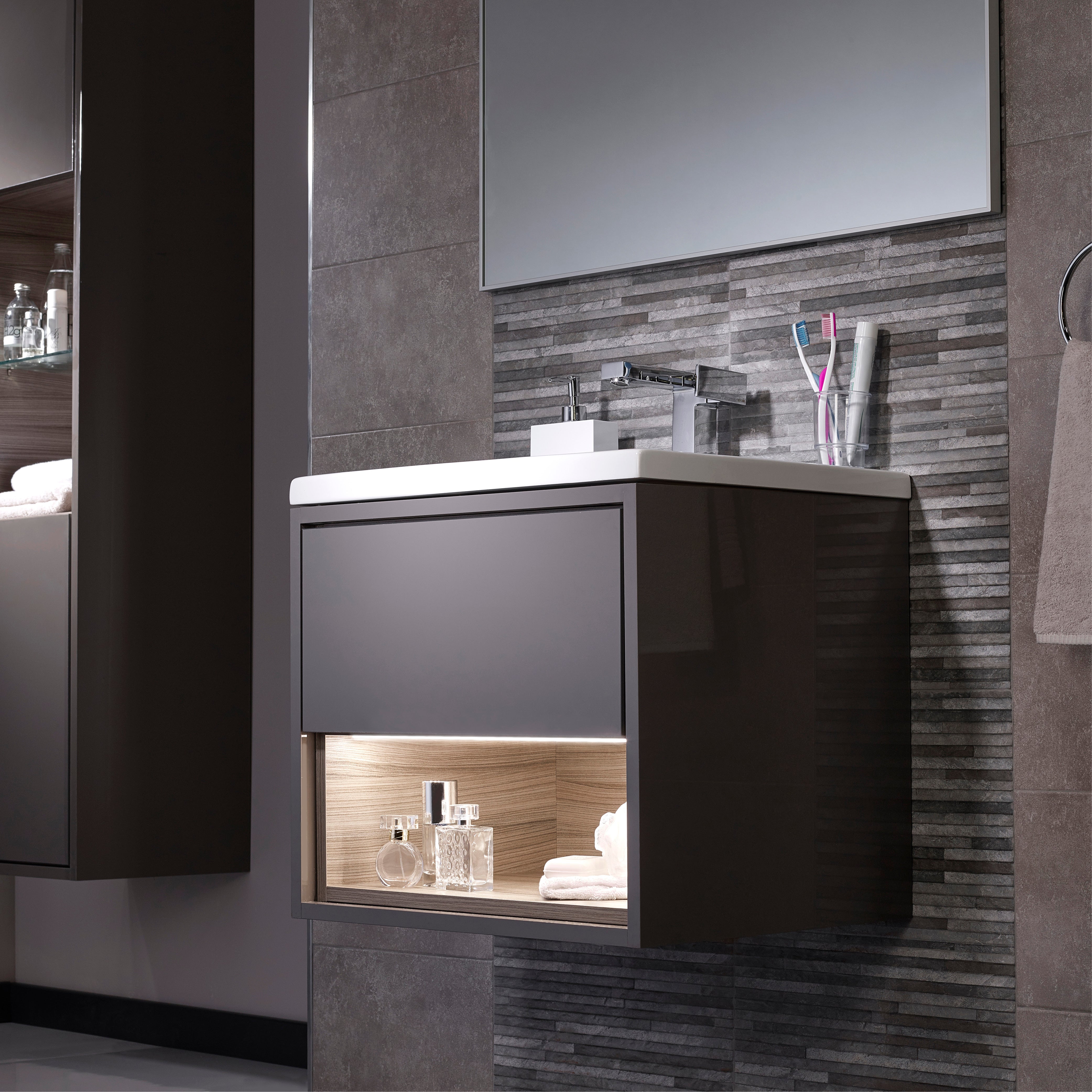 et les tiroirs de la salle de bain contribuent à éclairer le contenu pour en faciliter l'utilisation, tout en ajoutant un élément de luxe supplémentaire au design.