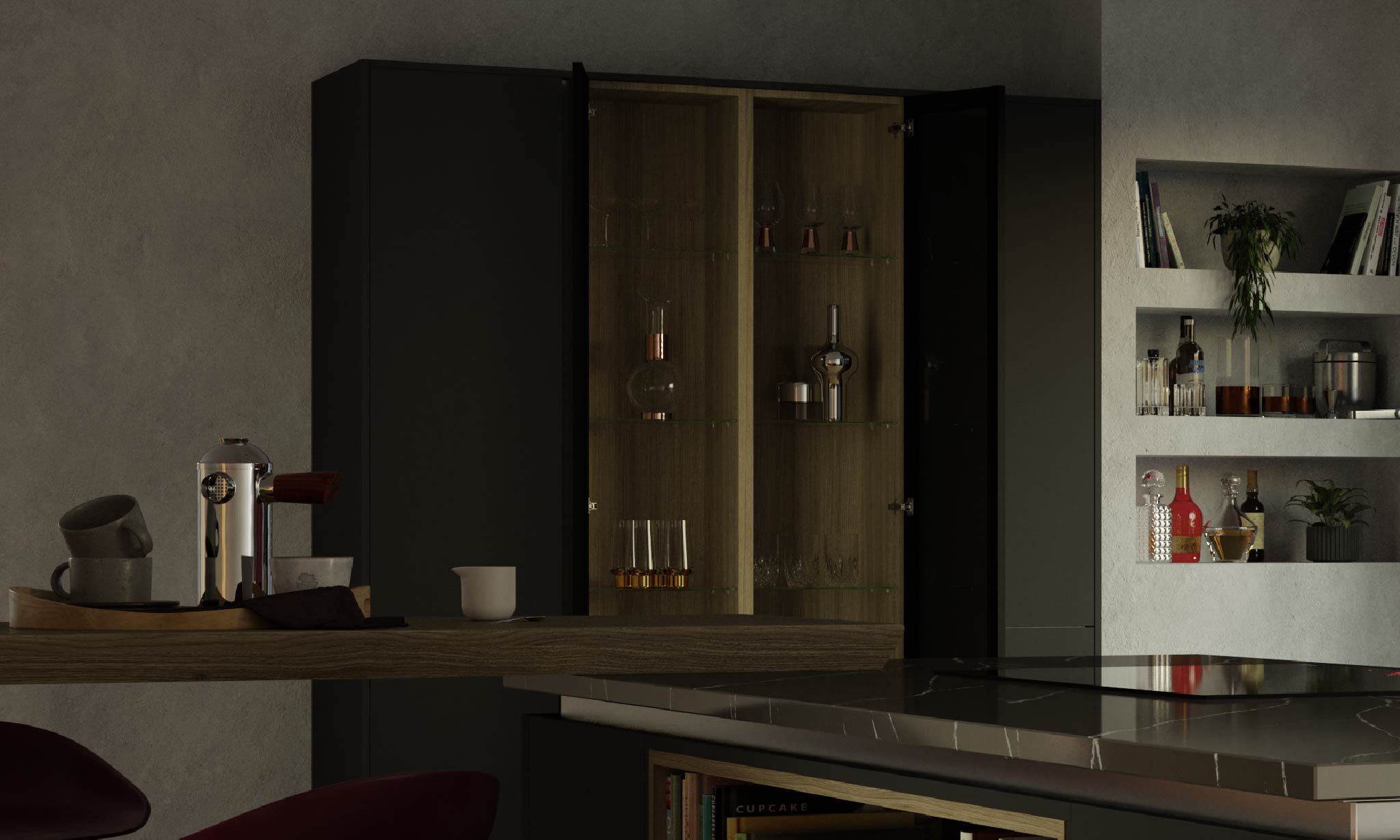 Glow Pro émet un éclairage d'ambiance relaxant qui traverse les étagères en verre et se diffuse dans la cuisine.