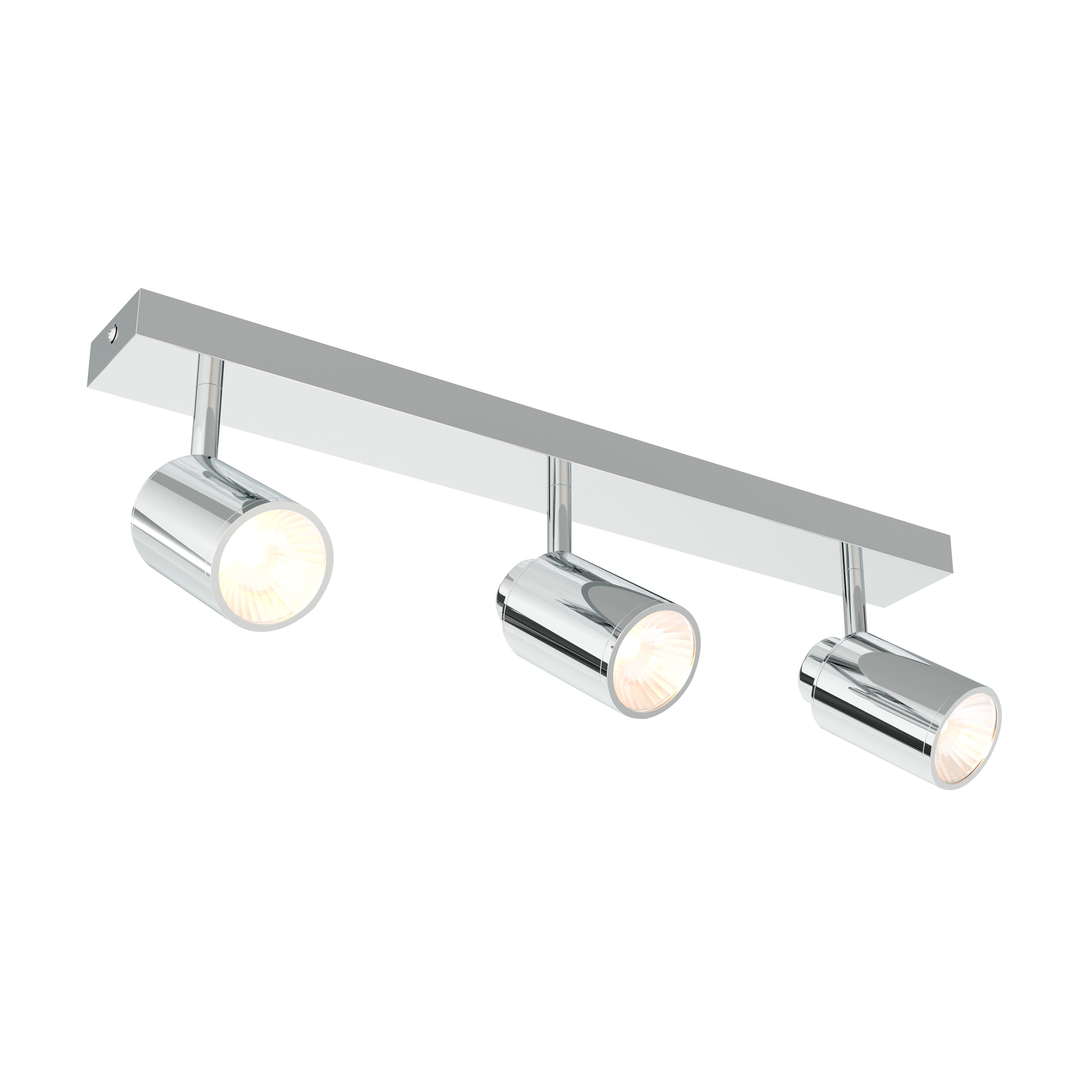 Barre de spots de salle de bain au fini chromé avec têtes réglables. Disponible en barre à 3 spots et en barre à 4 spots. Nécessite des ampoules GU10 (ampoule non incluse).